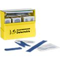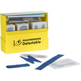 Adequado para todos os setores de actividade em que se lida com produtos alimentares. Reconhecimento visual rápido, cor azul, tiras metálicas incorporadas permitem deteção fácil e fiável pelos detetores de metal comuns. Os pensos são hipoalergénicos e respiráveis, o adesivo de acrilato é especialmente tolerado pela pele e adere com segurança. Os pensos são higienicamente selados individualmente. Sempre à mão e à vista no dispensador de pensos amarelo claro em plástico ABS com suporte de parede prático.Conteúdo: 130 pensos Detectable azuis, em 5 tamanhos e formatos diferentes (tiras em 2 tamanhos, ligaduras para os dedos, ligaduras para as articulações e para as extremidades dos dedos) e comprovativos de tratamento de emergência Minibloc.