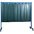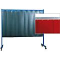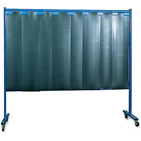 Armação robusta em tubo quadrado com revestimento de epóxi azul. As lamelas são fixadas no tubo superior com peças pendulares e espaçadores.